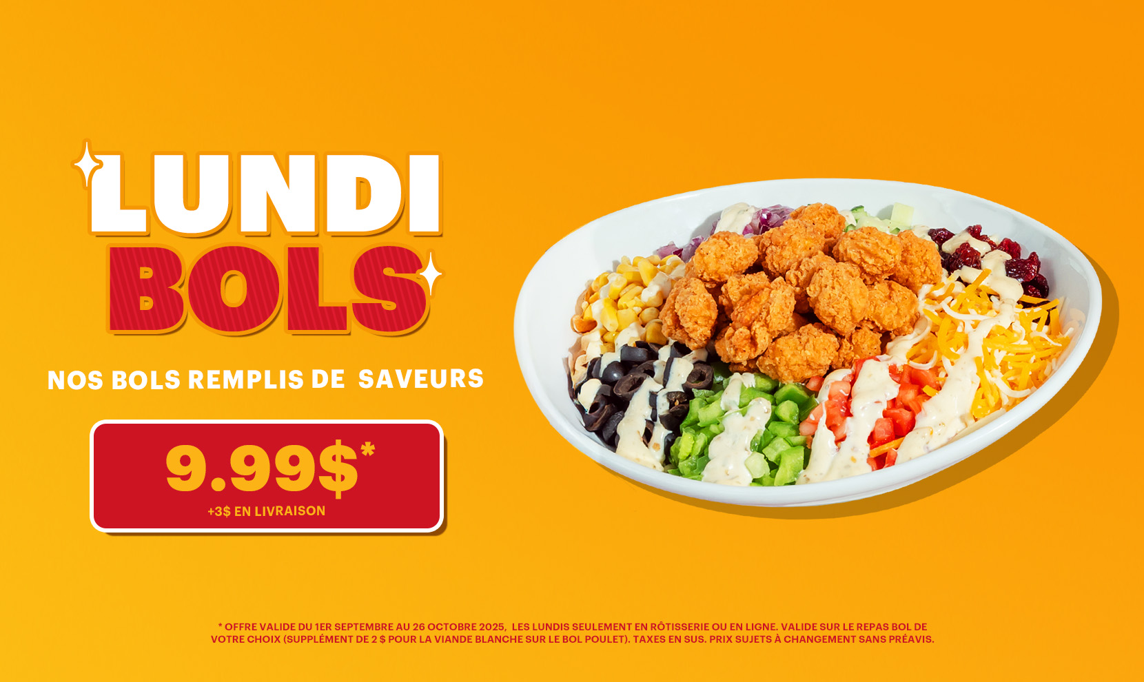 Notre délicieux poulet rôti est disponible au comptoir ou en livraison dans la région de Montréal, la Rive-Sud, Québec et Gatineau. Trouve ton restaurant le plus proche de chez toi!