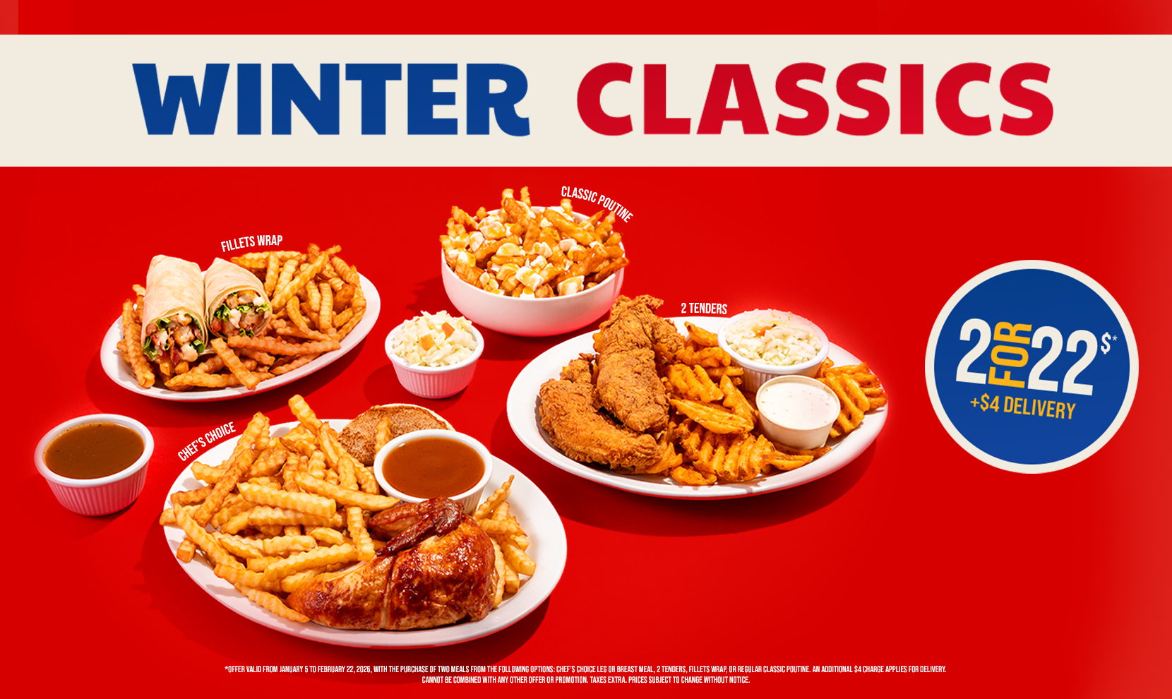 Our delicious roasted chicken is available at the counter or by delivery in the Montreal, South Shore, Quebec City and Gatineau areas. Find your nearest restaurant!